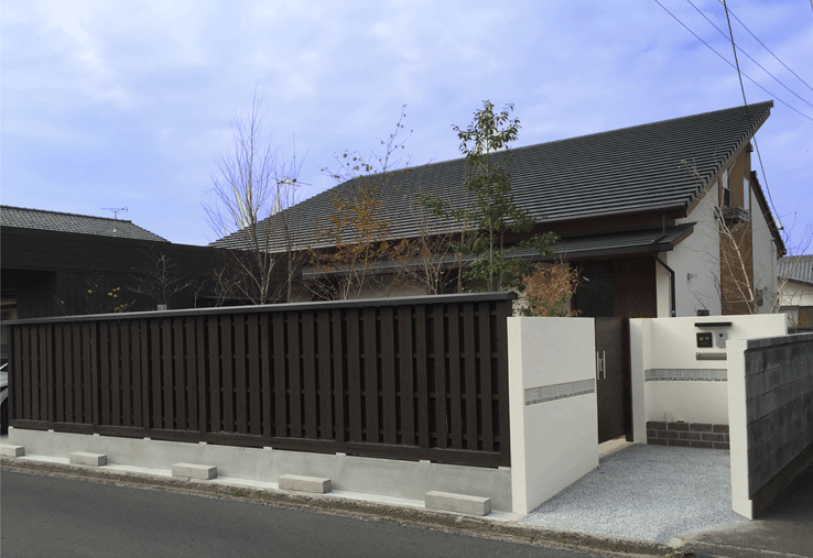 シャープな外観の緑に囲まれた住宅。平屋に見えますが、実は2階建て。