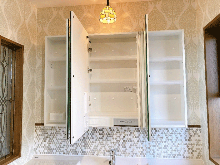 鏡の裏は全面収納なので、散らかりがちな細々としたものも余裕で片付きます。