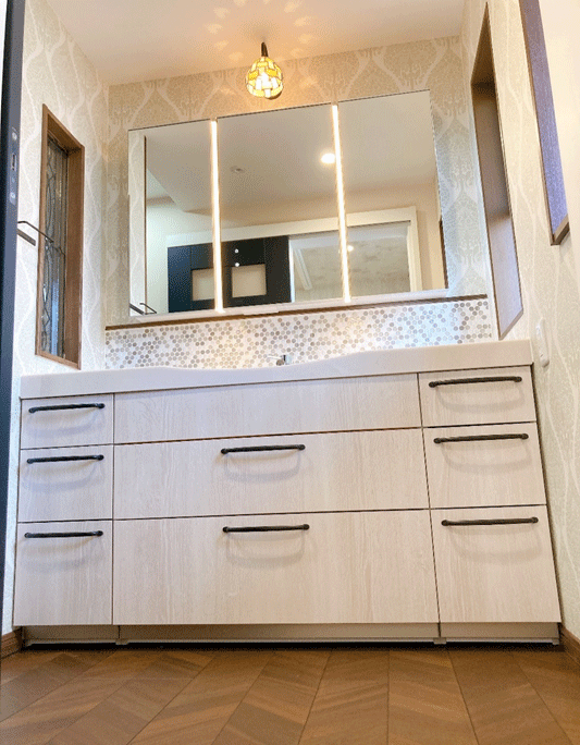 洗面台の幅はゆったり大きなサイズだから、忙しい朝に家族が並んでもゆったりと身支度をすることができます。